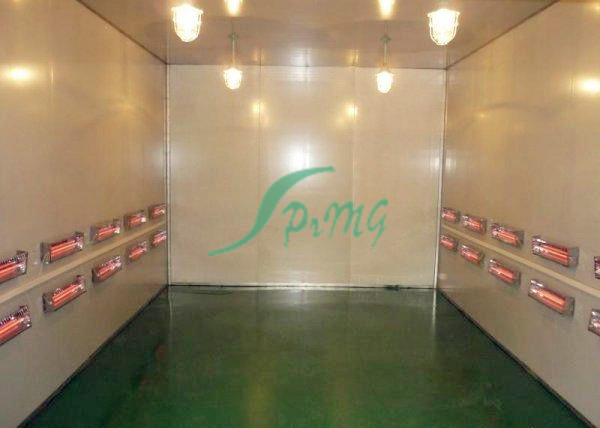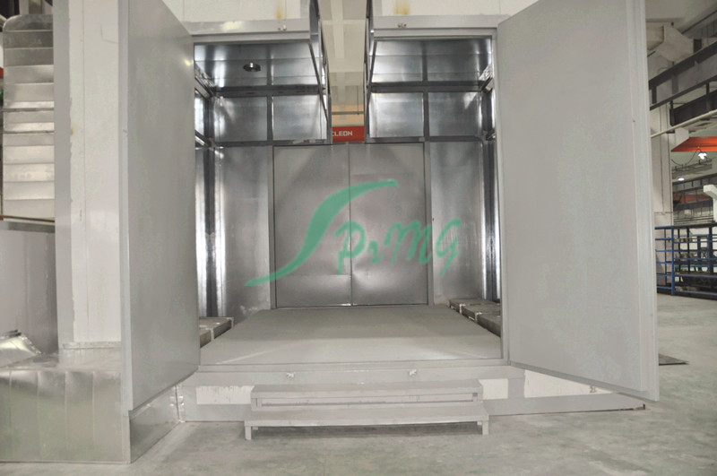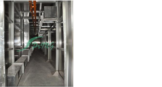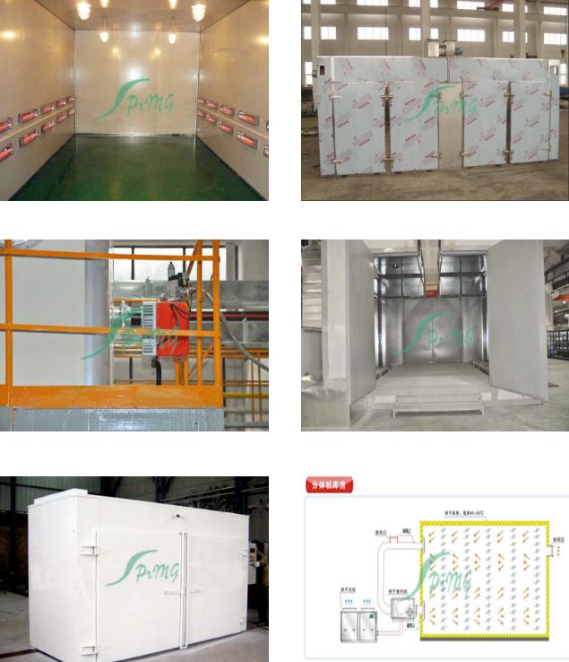 烘烤房又稱烘干固化房 針對大型電氣、電機、涂料、化學用品、外表進行固化、食品及各類產品的水分烘干 先進的熱風循環系統使工作室溫度分布均勻。低噪聲風機系統創造了安靜的工作環境。密封電熱管加熱,性能穩定,壽命長。底部裝有軌道并配有供裝載工件或試件 的臺車,工作效率高。進、排氣裝置,可調節工作室的換氣量。獨立控制臺,即可就近控制,也可集中到控制室統一控制。可選用進口高精度智能程序控溫儀表控 溫,P.I.D參數自調整,固態繼電器調功,可預設多段程序控溫曲線。智能控溫儀表控溫,控制靈敏可靠。記錄儀記錄工作全過程溫度曲線。超溫保護裝置能發 出聲光報警信號并切斷加熱電源,保護設備及工件的安全。